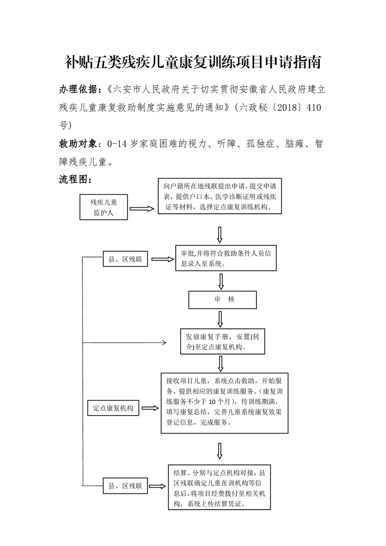 | 名 称: | 霍邱县补贴五类残疾儿童康复训练项目申请指南 |
