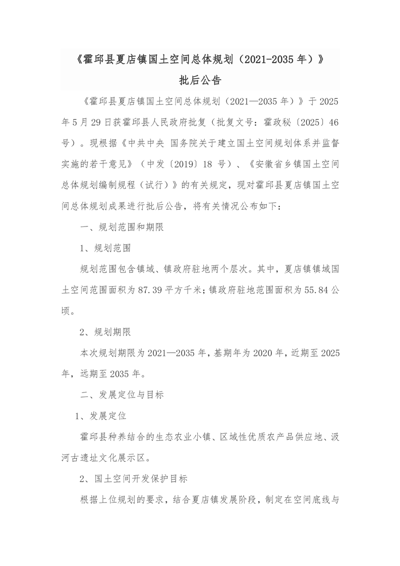 《霍邱县夏店镇国土空间总体规划(2021-2035年)》批后公告