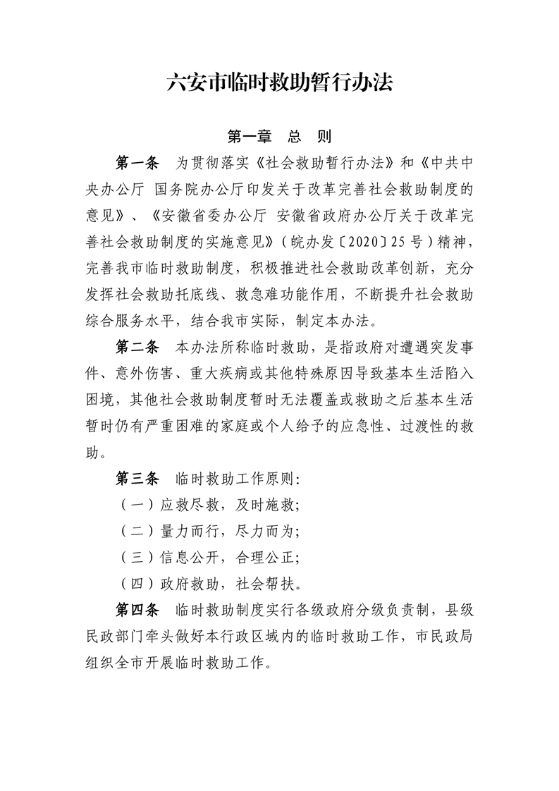 | 名 称: | 六安市临时救助暂行办法 | ||