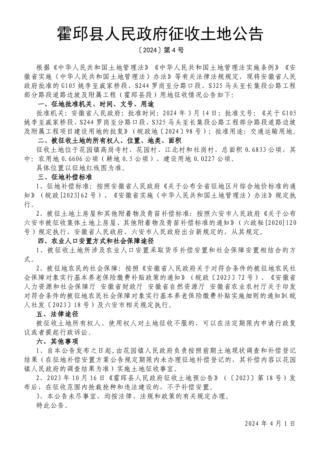 霍邱县人民政府征收土地公告〔2024〕第4号
