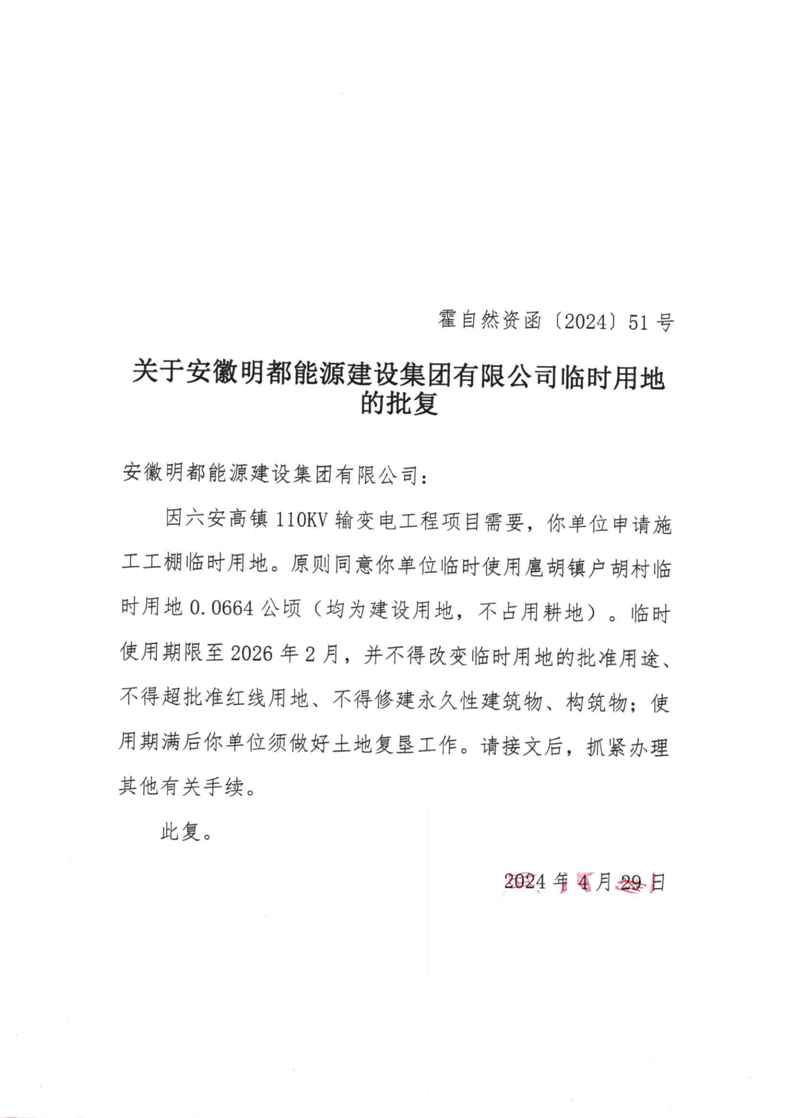 名 称: | 关于安徽明都能源建设集团有限公司临时用地的批复 |