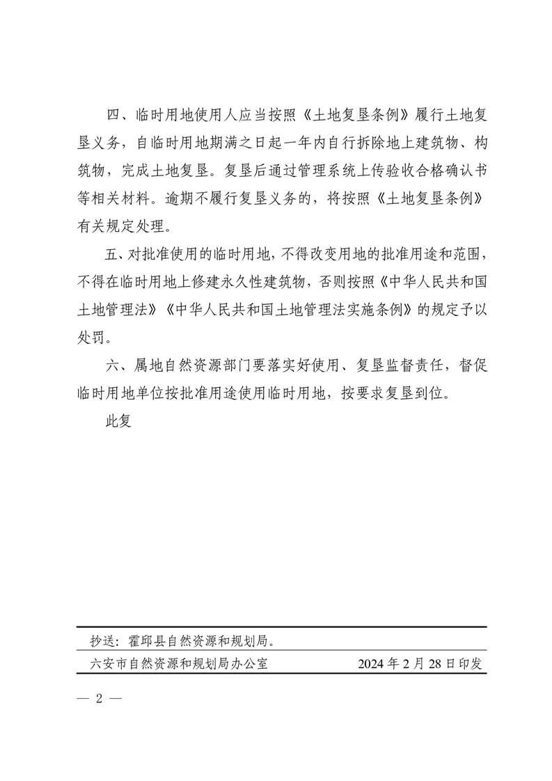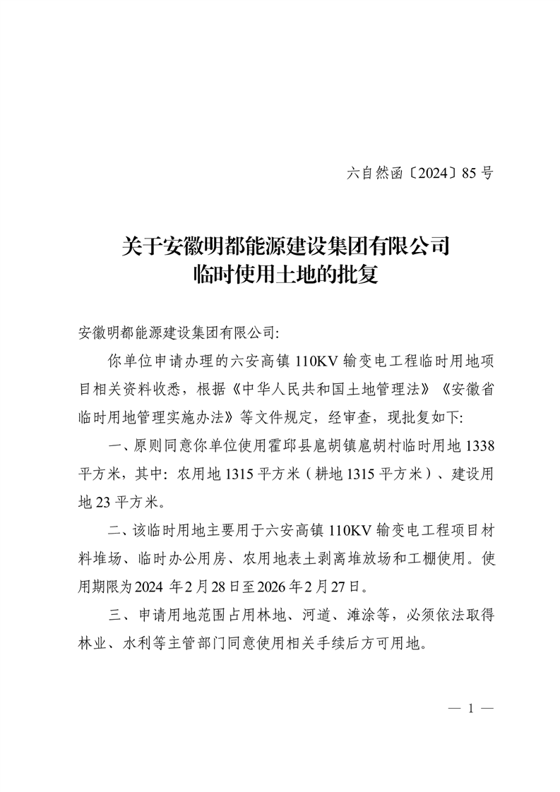 | 名 称: | 关于安徽明都能源建设集团有限公司临时使用土地的批复(六安高镇 110KV 输变电工程临时用地项目) | ||