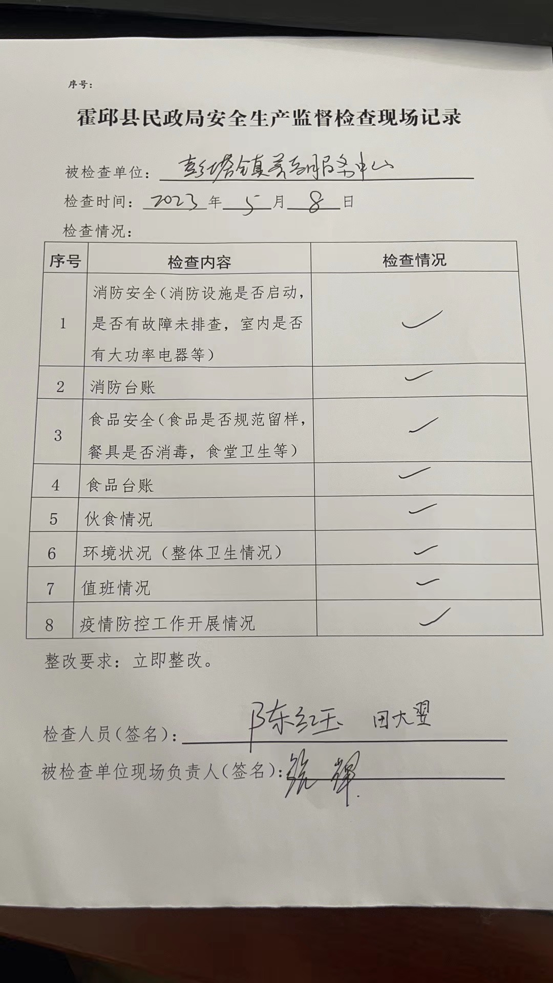 霍邱县民政局食品、消防安全现场检查记录——彭塔镇养老服务中心