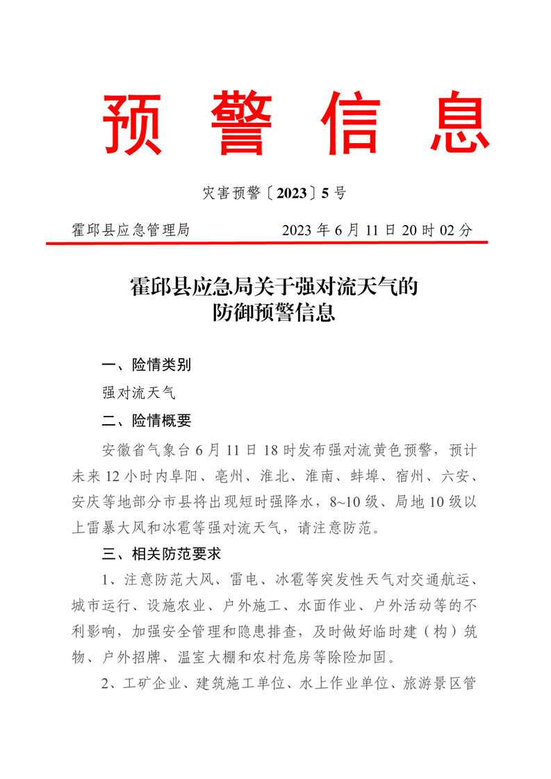 霍邱县应急局关于强对流天气的预警信息