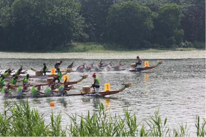 上午8时,16支龙舟队在该县水门塘公园赛道内整装待发。起点上各支队伍剑拔弩张,随着总裁判员开赛锣一响,比赛正式开始。龙船如离弦的箭“嗖”的一下往终点划去,顿时水花四溅。各支队伍配合默契、拼尽全力,龙船速度飞快,如蛟龙出水,逐浪奋进。岸边人潮涌动,观众助力呐喊。伴随着震耳欲聋的锣鼓声和呐喊声,选手们齐心合力、奋楫前行。最终,亳州学院龙舟队技高一筹,夺得冠军。
