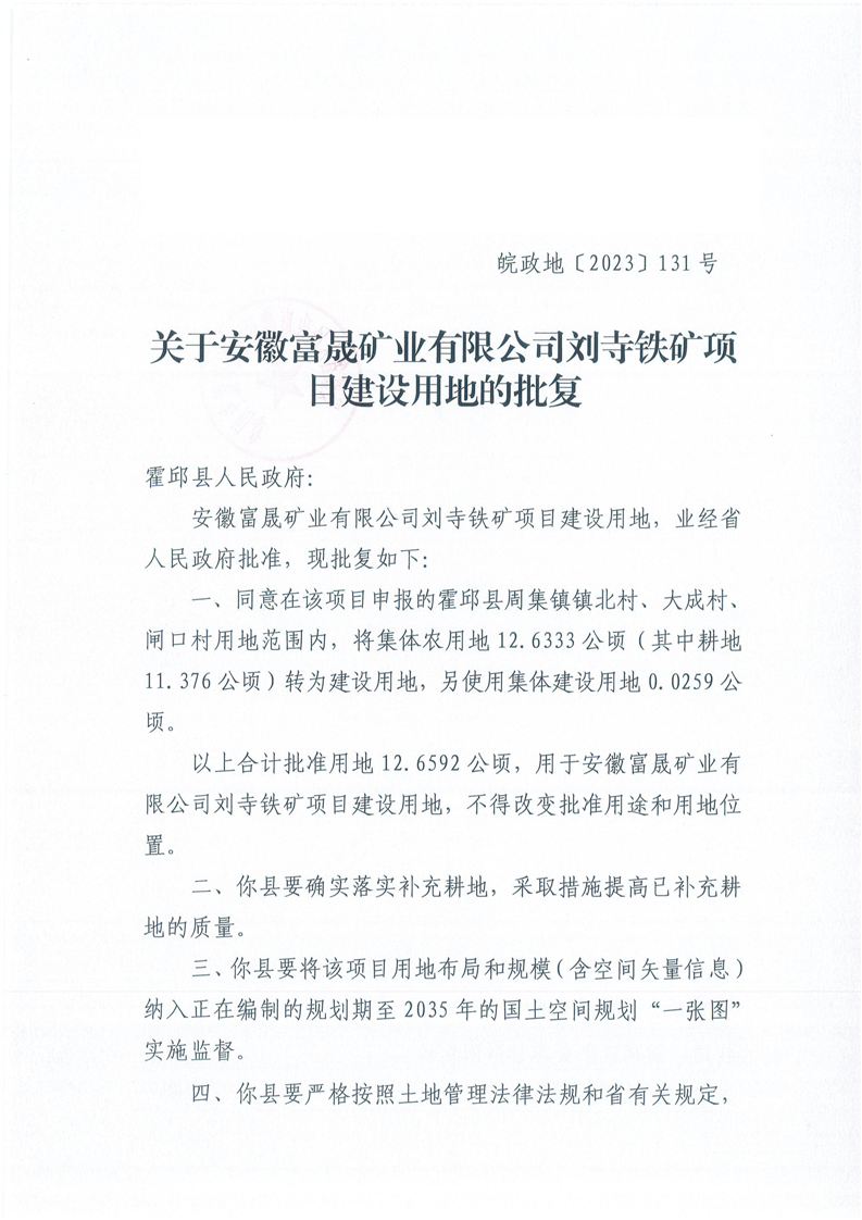 | 名 称: | 关于安徽富晟矿业有限公司刘寺铁矿项目建设用地的批复 |