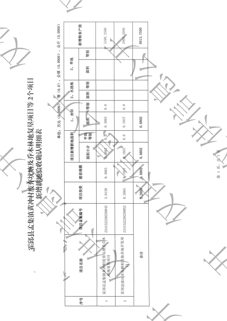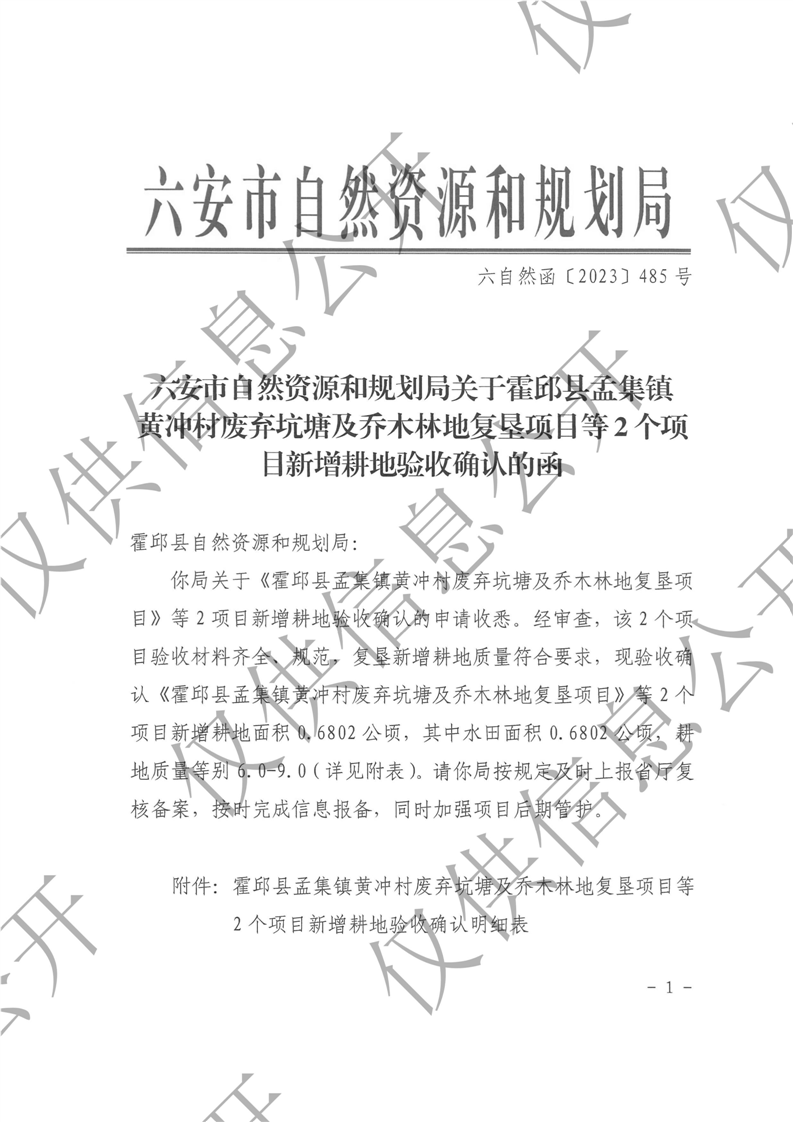 | 名 称: | 孟集镇黄冲村废弃坑塘及乔木林地复垦项目等2个新增耕地项目验收批复 |