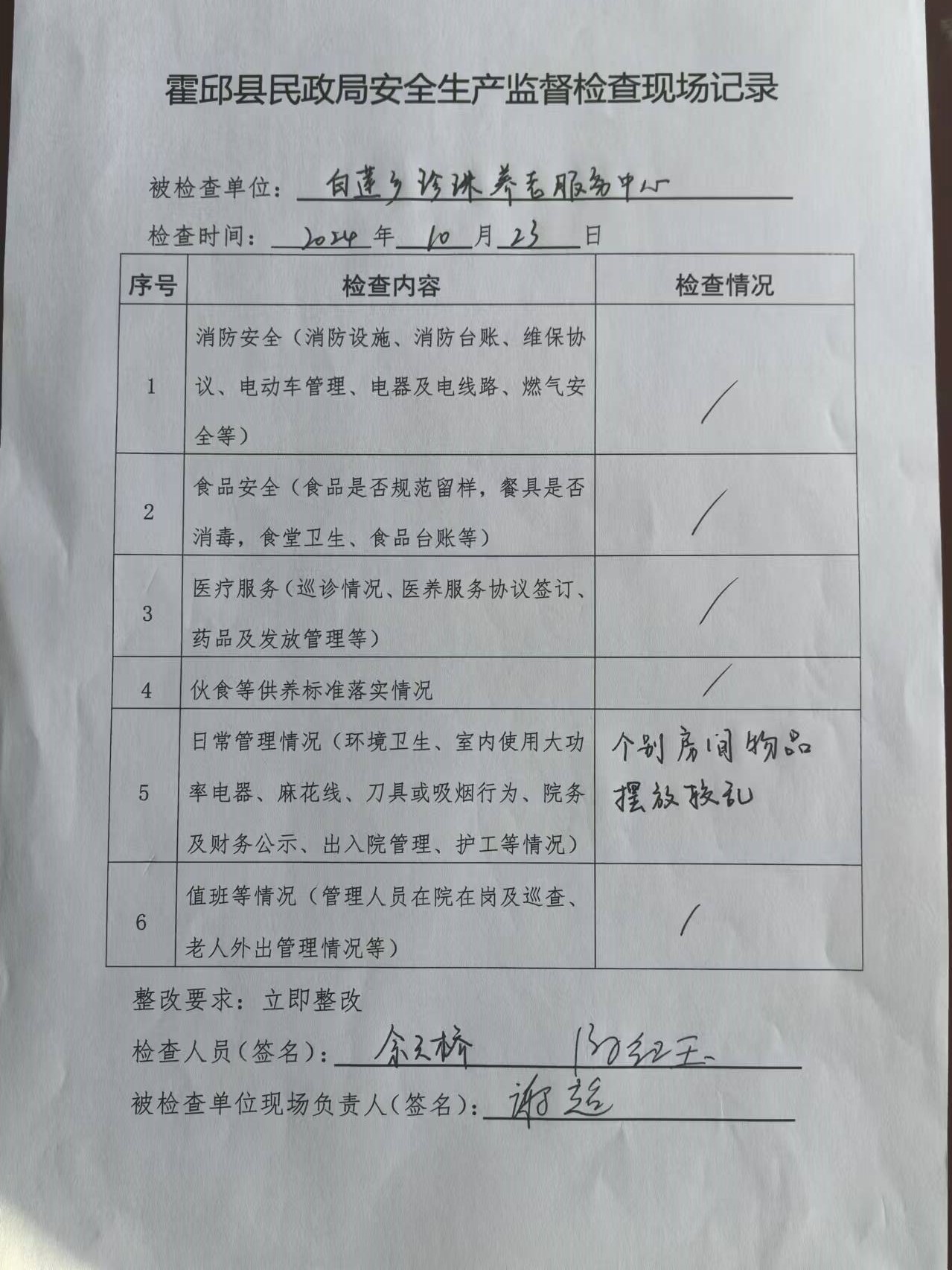 霍邱县民政局食品安全检查现场记录——白莲乡养老服务中心