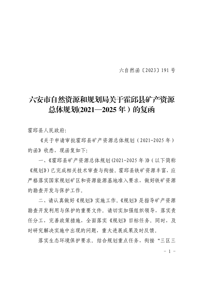 | 名 称: | 【批复】六安市自然资源和规划局关于霍邱县矿产资源总体规划(2021—2025 年)的复函 |