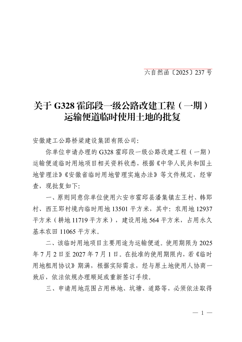 名 称: | 关于 G328 霍邱段一级公路改建工程(一期)运输便道临时使用土地的批复 | ||