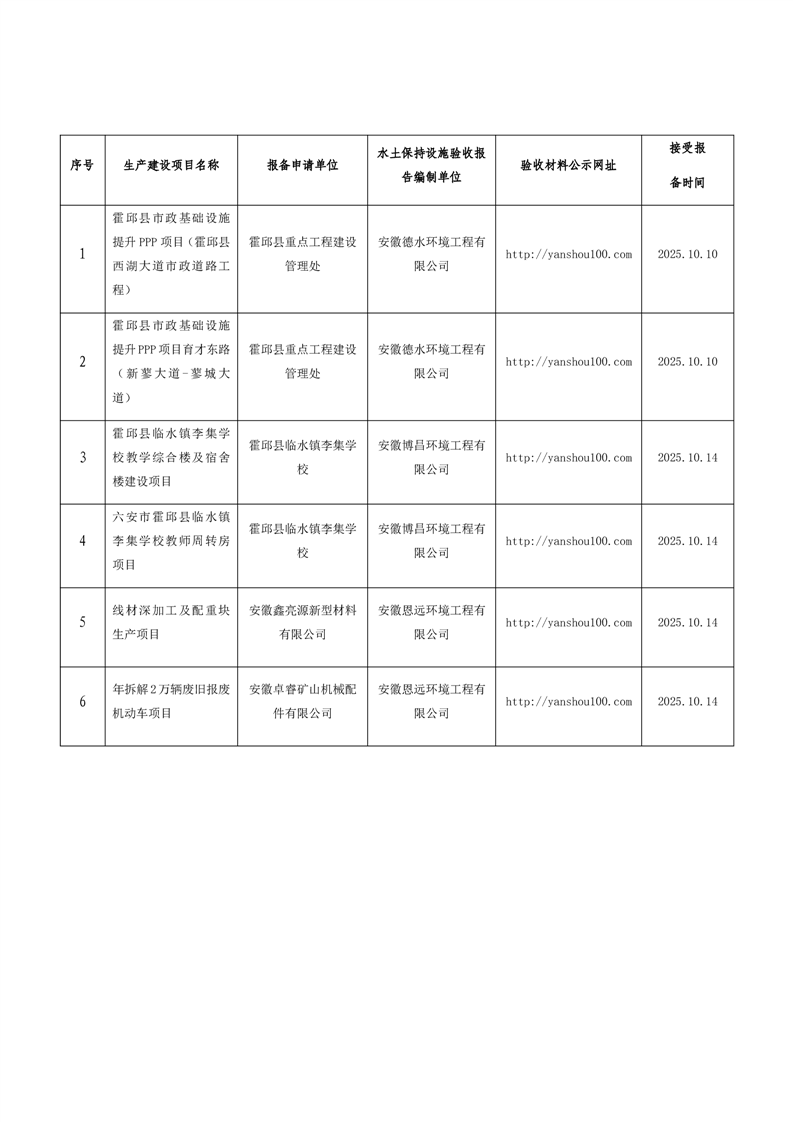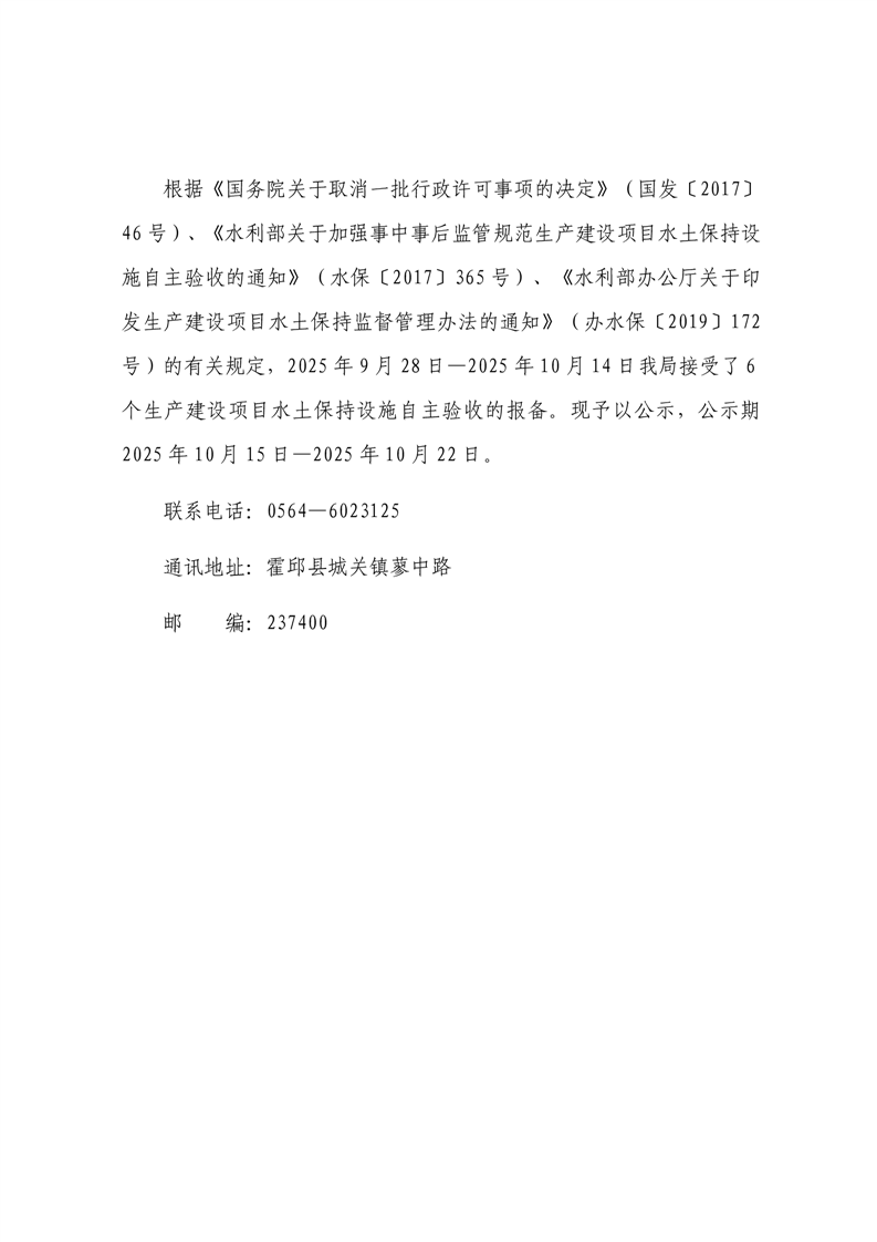 | 名 称: | 霍邱县水利局关于2025年10月15日—2025年10月22日生产建设项目水土保持设施自主验收报备公告 |