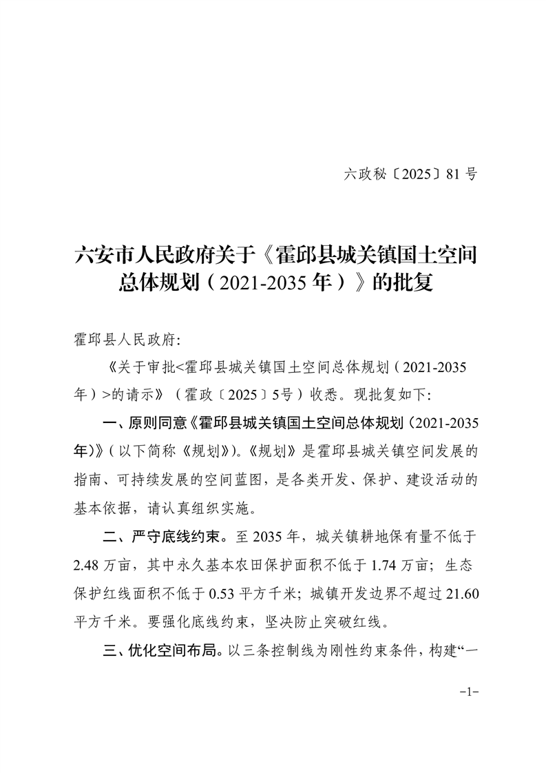 | 名 称: | 六安市人民政府关于《霍邱县城关镇国土空间总体规划(2021-2035 年)》的批复 | ||