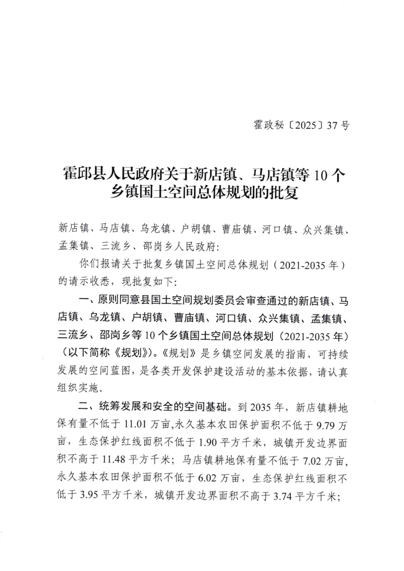 | 名 称: | 霍邱县人民政府关于新店镇、马店镇等10个乡镇国土空间总体规划的批复 | ||