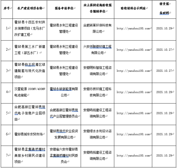 霍邱县水利局关于2025年10月22日—2025年11月3日生产建设项目水土保持设施自主验收报备公告