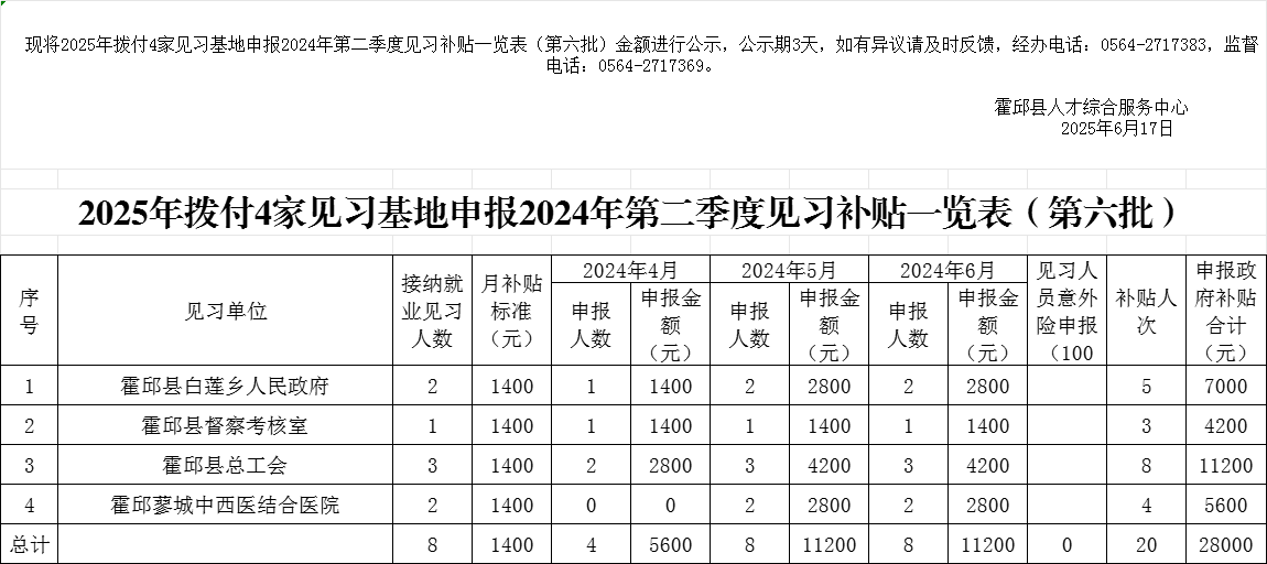 | 名 称: | 2025年拨付4家见习基地申报2024年第二季度见习补贴一览表(第六批) |