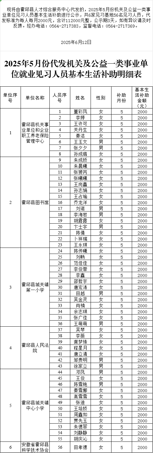 | 名 称: | 2025年5月份代发机关及公益一类事业单位就业见习人员基本生活补助明细表 | ||