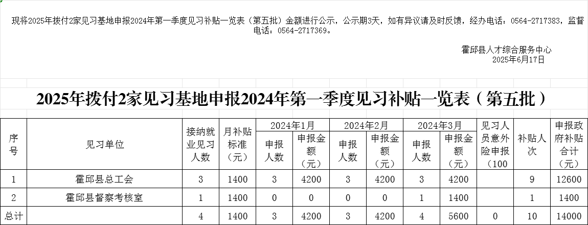 | 名 称: | 2025年拨付2家见习基地申报2024年第一季度见习补贴一览表(第五批) |