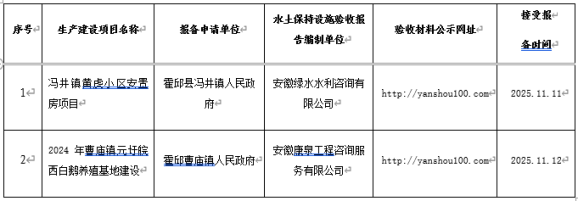 根据《国务院关于取消一批行政许可事项的决定》(国发〔2017〕46号)、《水利部关于加强事中事后监管规范生产建设项目水土保持设施自主验收的通知》(水保〔2017〕365号)、《水利部办公厅关于印发生产建设项目水土保持监督管理办法的通知》(办水保〔2019〕172号)的有关规定,2025年11月3日—2025年11月20日我局接受了2个生产建设项目水土保持设施自主验收的报备。现予以公示,公示期2025年11月20日—2025年11月28日。