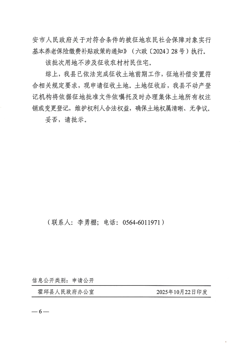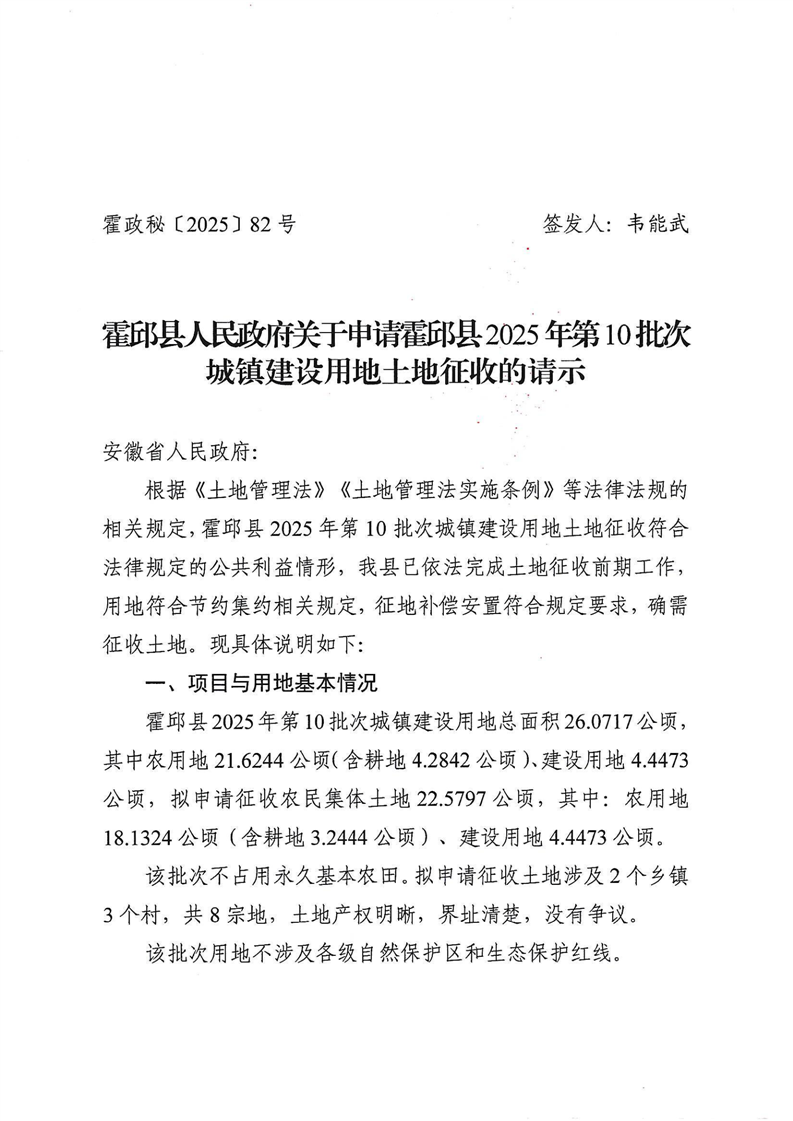 | 名 称: | 霍邱县人民政府关于申请霍邱县2025年第10批次城镇建设用地土地征收的请示 |
