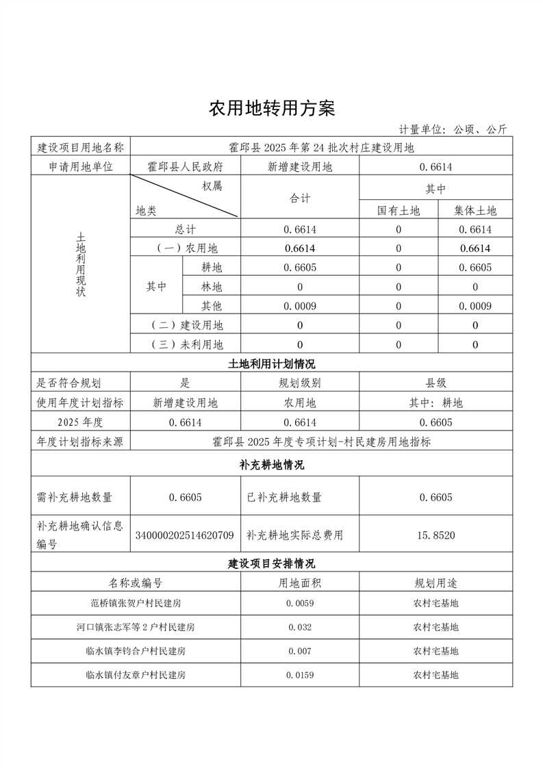 | 名 称: | 霍邱县2025年第24批次村庄建设用地(农转用方案) |