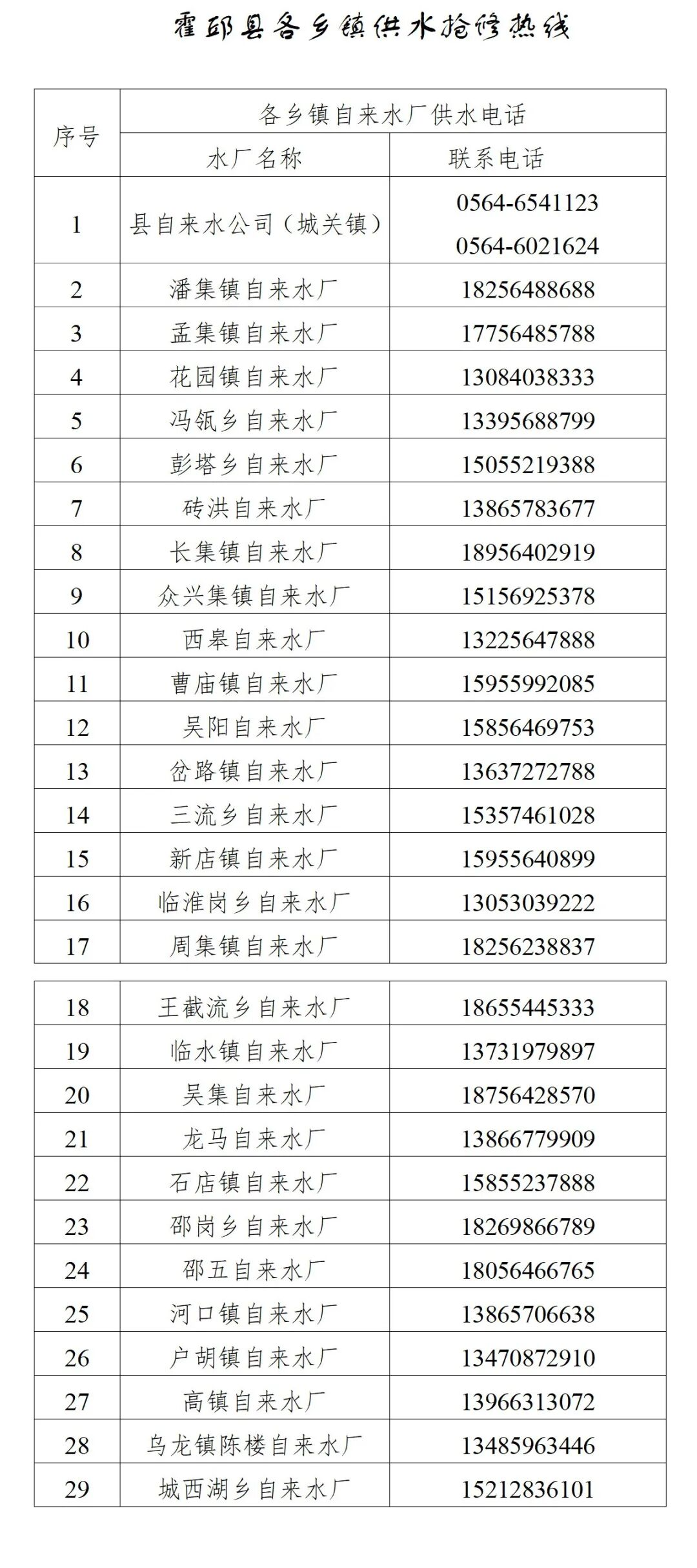 霍邱县供水服务电话:96318(各乡镇直接联系方式见附件);