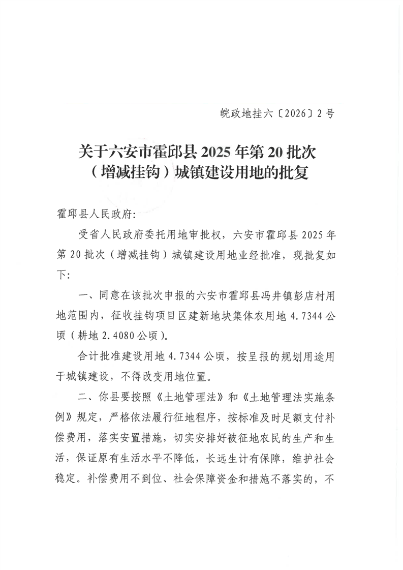 关于六安市霍邱县2025年第20批次(增减挂钩)城镇建设用地的批复