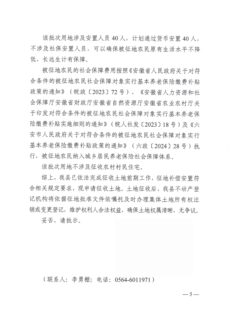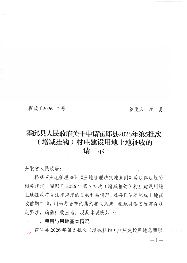 | 名 称: | 霍邱县人民政府关于申请霍邱县2026年第5批次(增减挂钩)村庄建设用地土地征收的请示 |