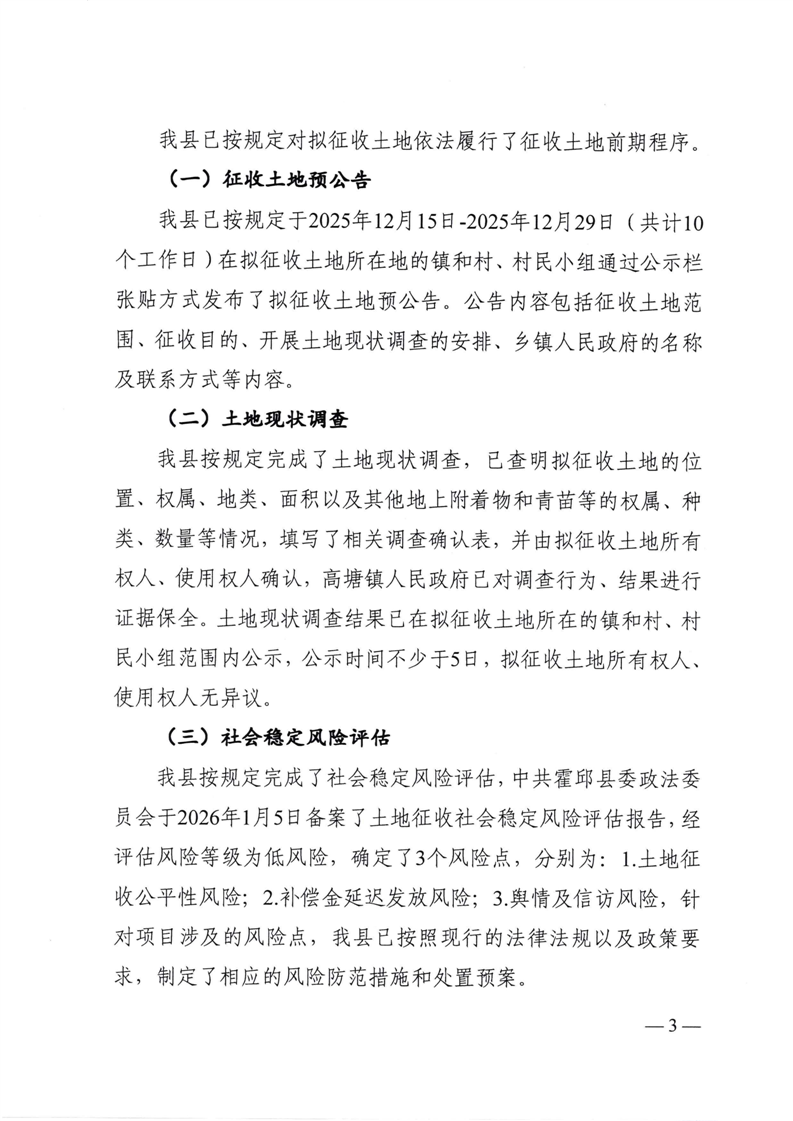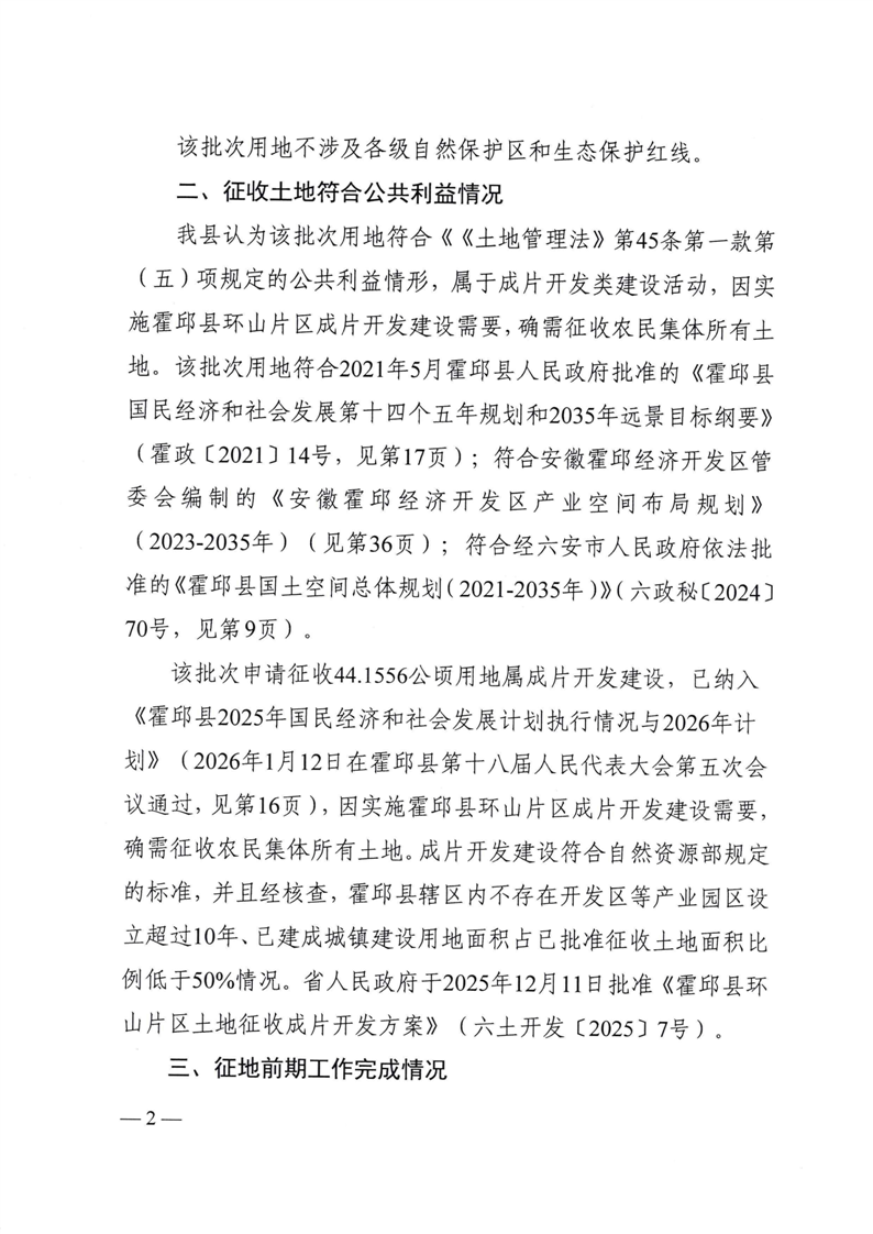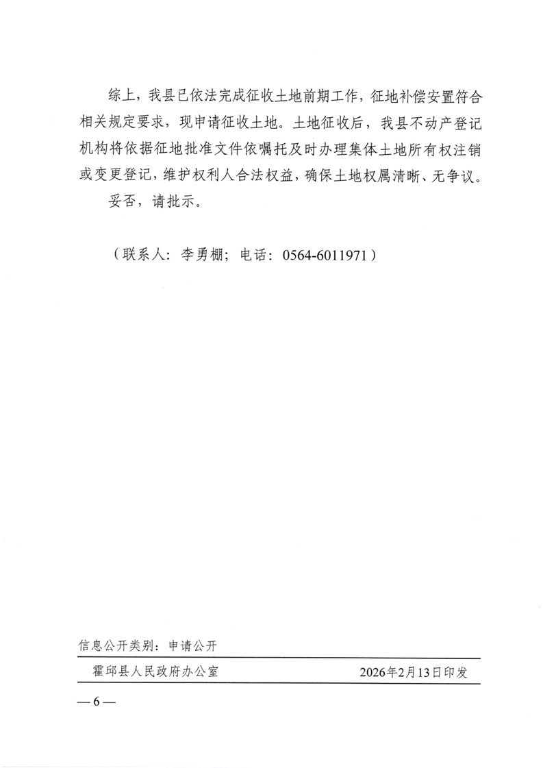 | 名 称: | 霍邱县人民政府关于申请霍邱县2026年第1批次城镇建设用地土地征收的请示 | ||