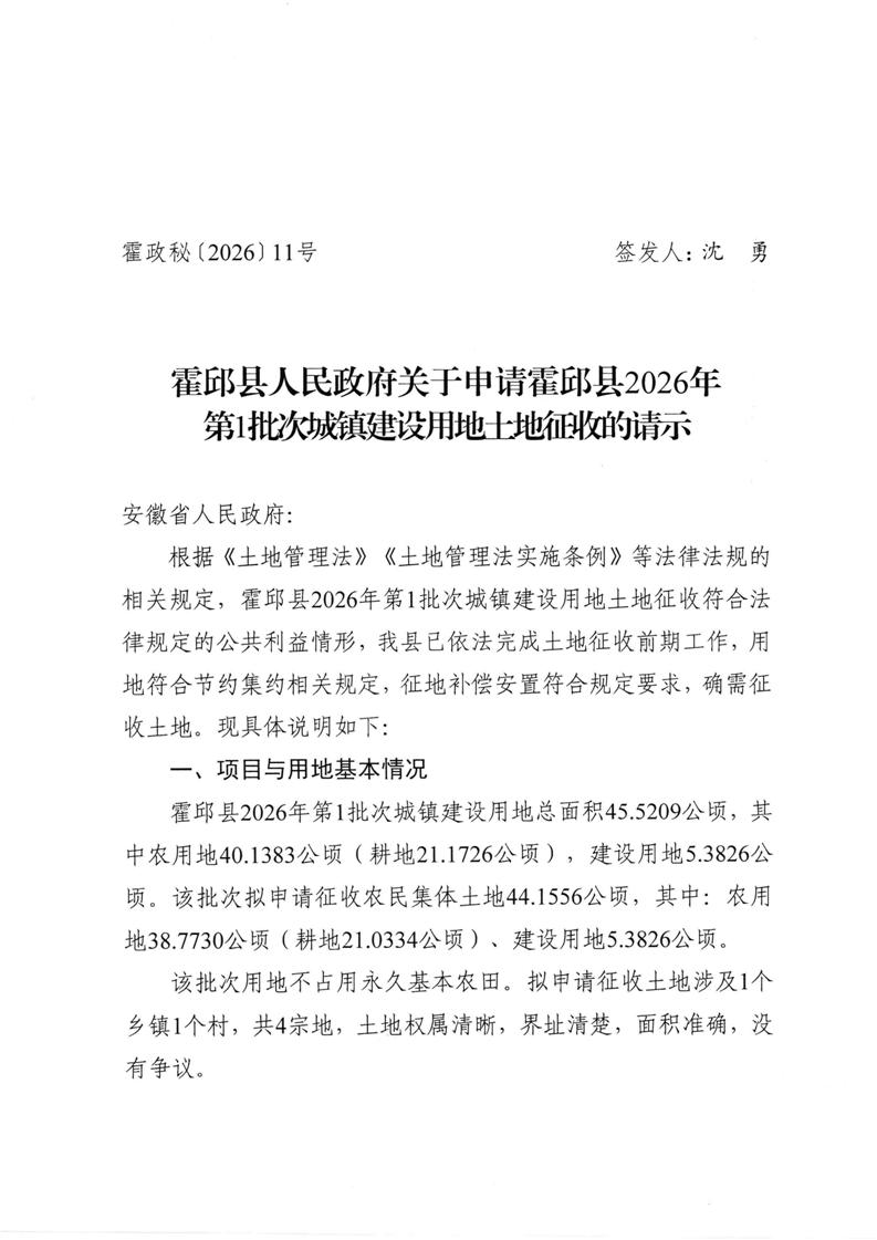 | 名 称: | 霍邱县人民政府关于申请霍邱县2026年第1批次城镇建设用地土地征收的请示 |