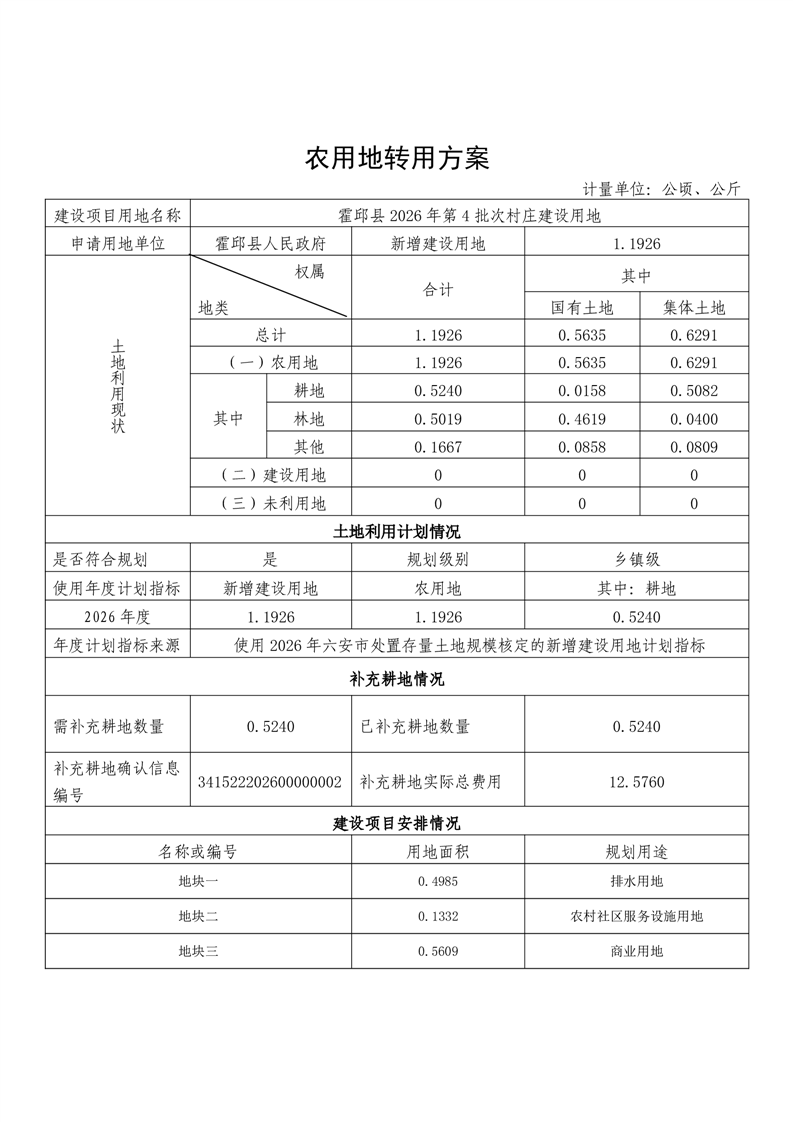 | 名 称: | 霍邱县2026年第4批次村庄建设用地(农转用方案) |