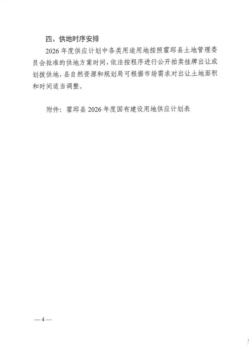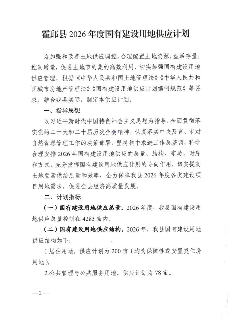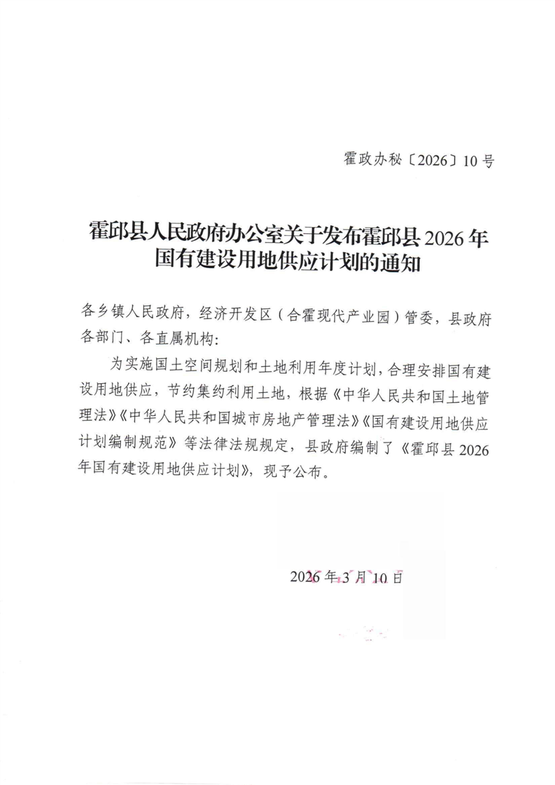 | 名 称: | 霍邱县人民政府办公室关于发布霍邱县2026年国有建设用地供应计划的通知 |