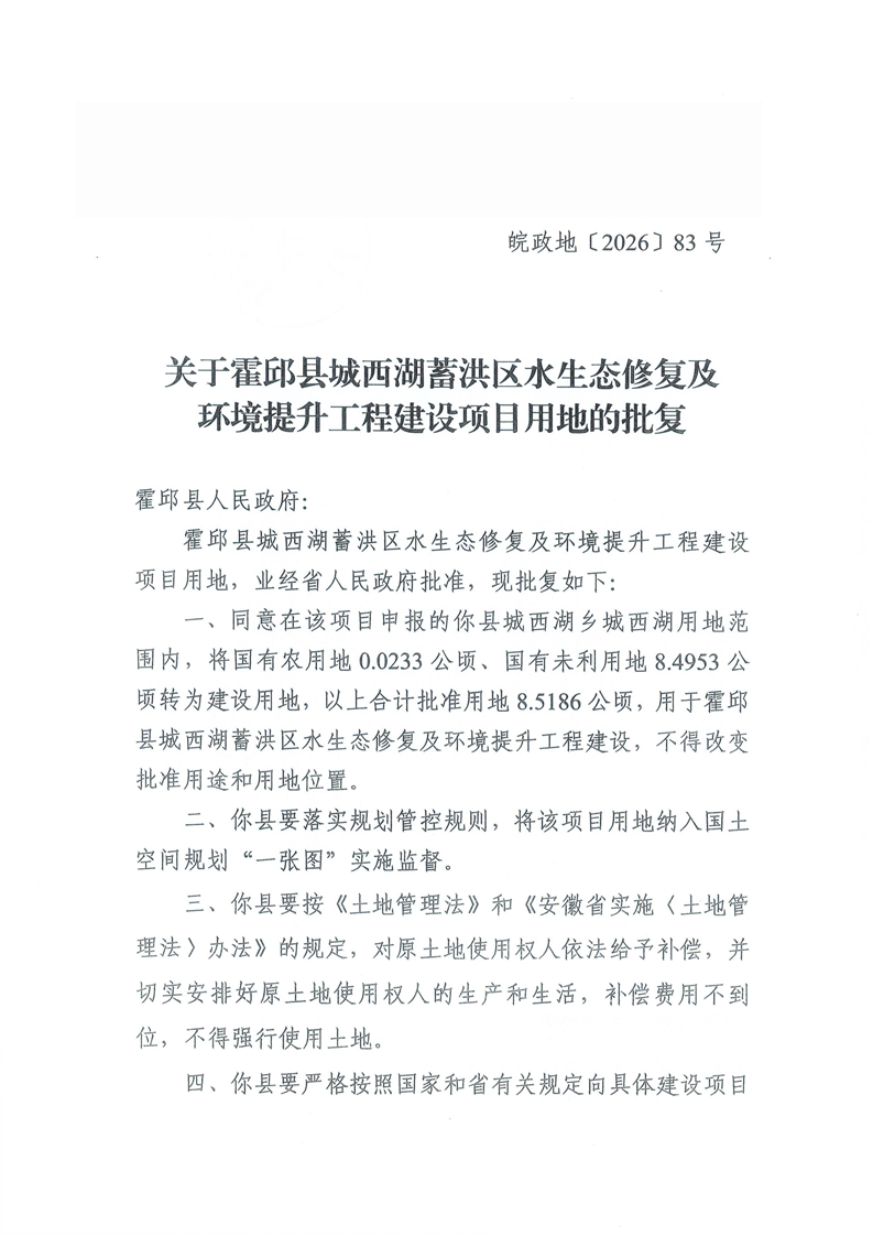 关于霍邱县城西湖蓄洪区水生态修复及环境提升工程建设项目用地的批复