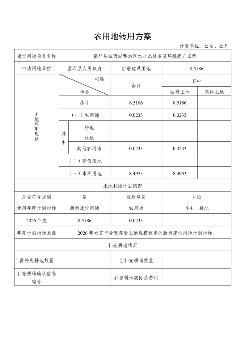 | 名 称: | 霍邱县城西湖蓄洪区水生态修复及环境提升工程农转用方案 | ||