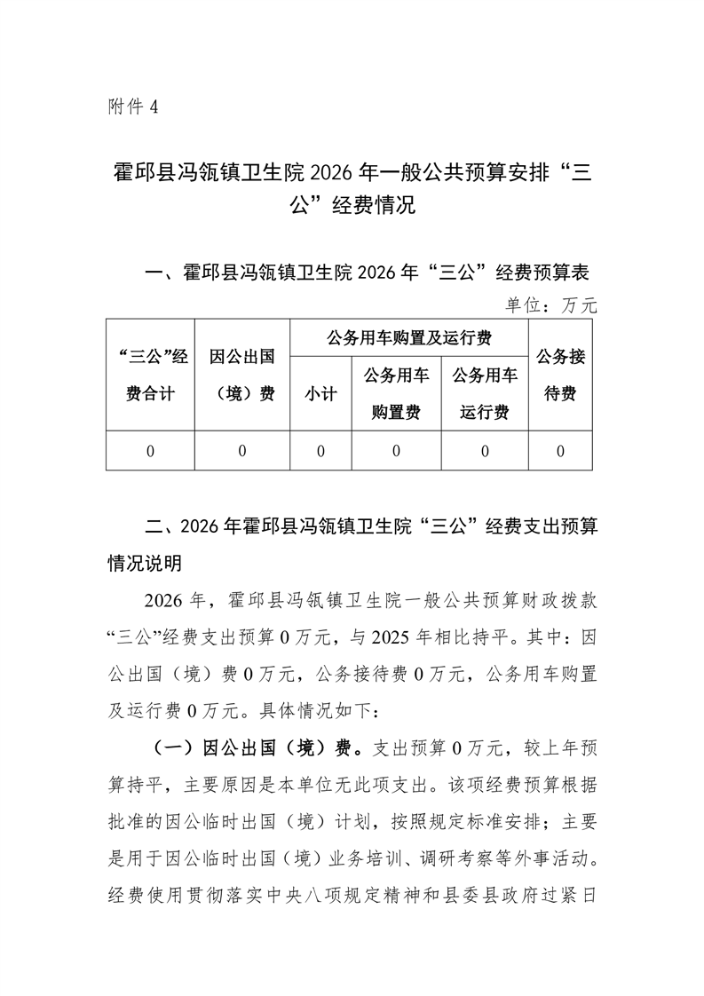 霍邱县冯瓴镇卫生院2026年单位一般公共预算安排“三公”经费情况公开