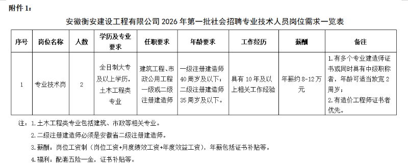 附件1:安徽衡安建设工程有限公司2026年第一批社会招聘专业技术人员岗位需求一览表